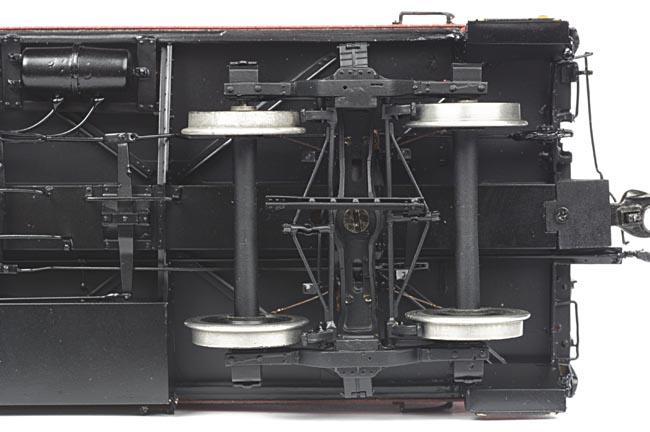 An underside view of the T-JJ type truck offers a look at the complete detail included in this area of the model. The journal boxes are also equipped with ball-bearings for smooth and reliable operation.
