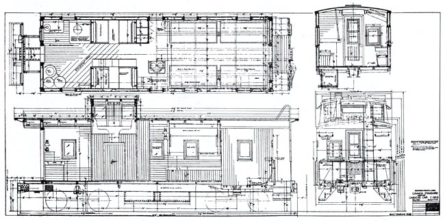 Shown above is caboose #205, a C-30-3 class wooden caboose which was built in 1930, this photo was taken in 1946. The plan and elevation view drawings for this class are shown immediately below. The construction of the C-30-3 class began in 1929 and continued for two years, resulting in the construction of more than 79 cabooses assigned to various sections of the road. Almost identical to the earlier sub-categories in the class, the dash 3's were unique in that they utilized a steel frame rather than the earlier wooden type. Despite their early construction, many remained in service into the 60's. There were numerous upgrades and paint scheme changes during their service life that can be modeled. |