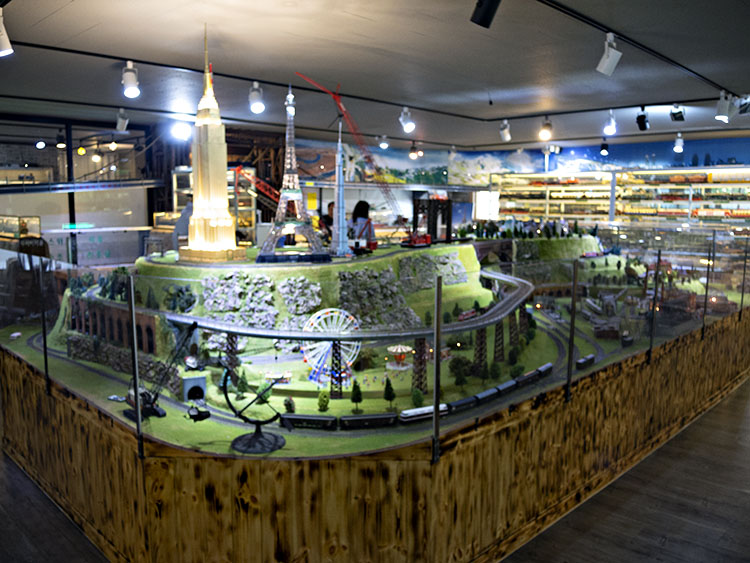 There are booths for seating while enjoying your beverages around the perimeter of the museum and even the booths themselves include models displayed in lighted cases. You can also see the trains that operate around the perimeter of the room at eye level.