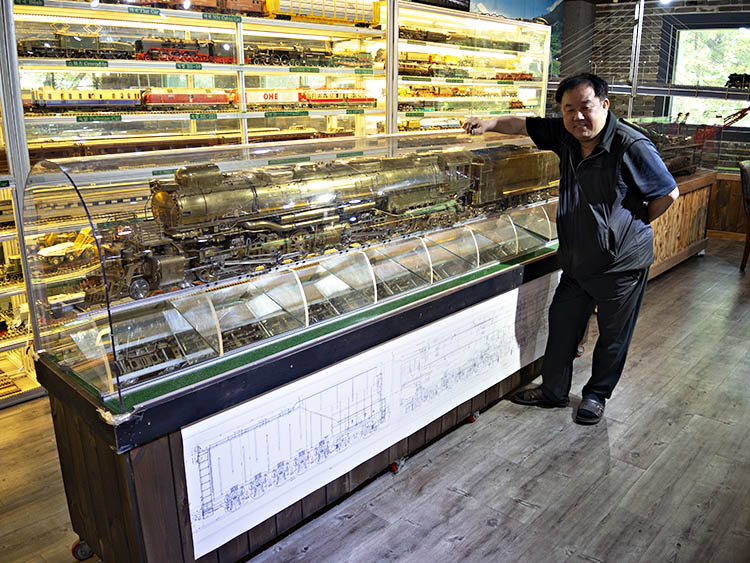 A 1:87 scale model of 'Big Muskie' built by Mr. Lee's former partner Mr. Han is shown tucked in the corner below. Again, one of the operating trains that circle the room can be seen above it.
