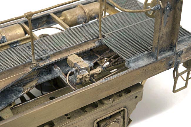 A close up view of the brake valve, piping and construction detail of the end platform.