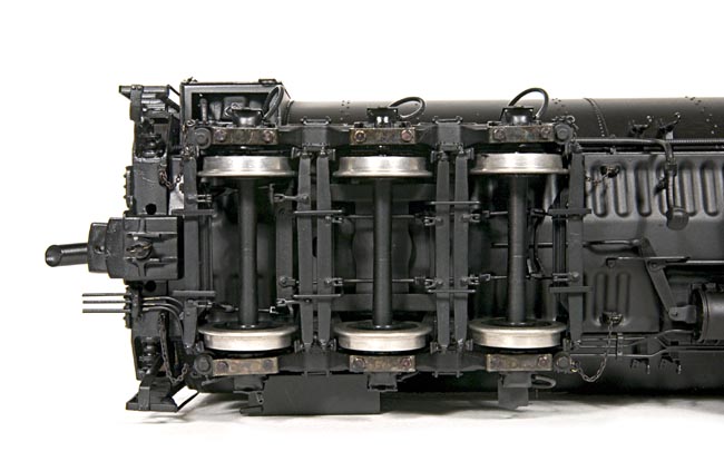 A close up view of the front truck assembly on the 'post-war' tender. Notice the complete brake detail as well as the safety chains at each corner, this is detail common to both versions of our model.