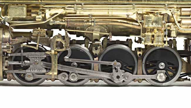 All component parts of the running gear are cast from nickel-silver for strength and durability. All crank pins will be equipped with ball-bearings as are all journals. You may notice portions of the equalized suspension above and behind the drivers, what you see are the real fabricated leaf springs and hangers. You may want to review images of the first sample which shows more of the suspension detail prior to being buried by additional detail. Also, notice the complete brake rigging and the reverse-gear linkage that will be electronically controlled for operation. |